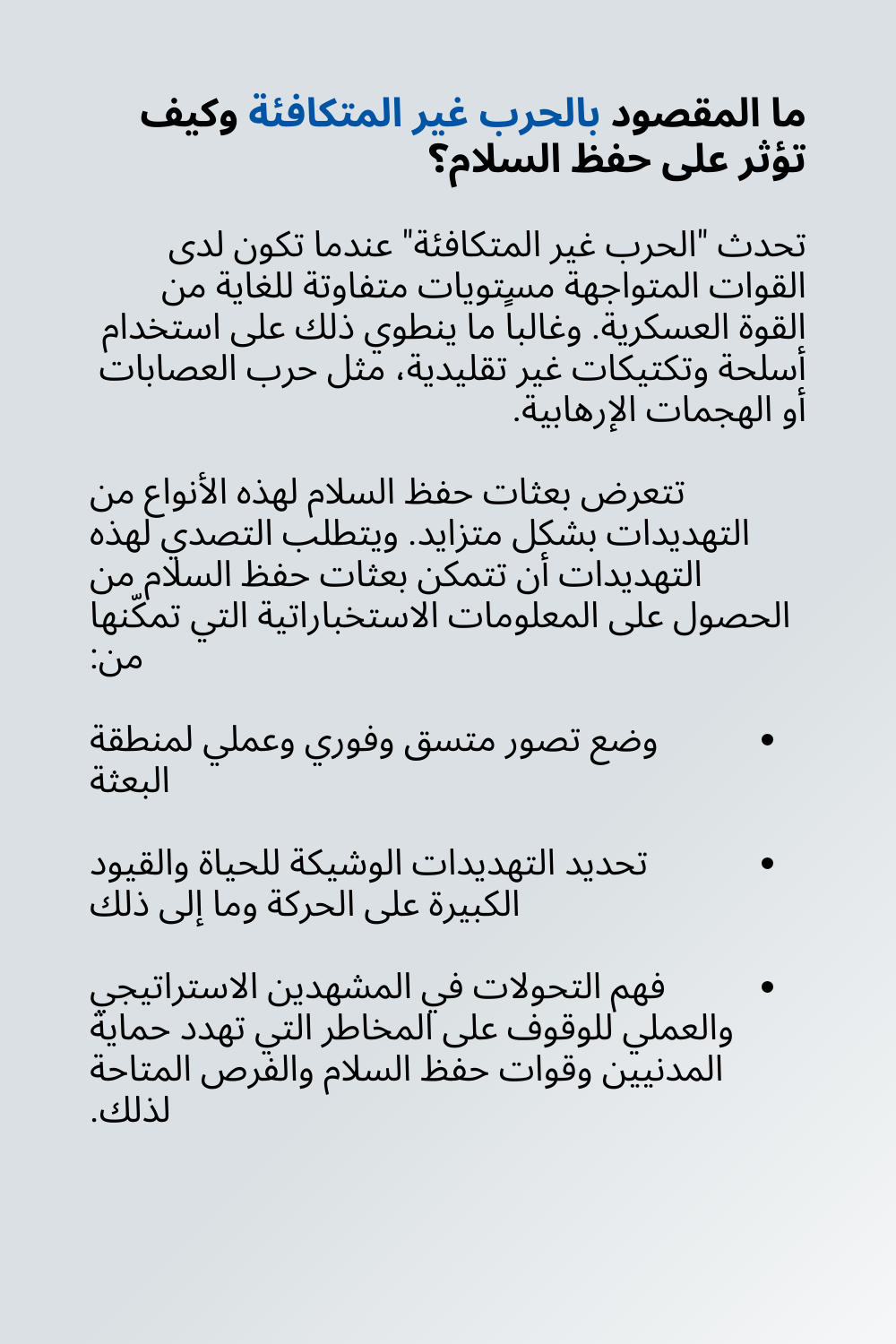 - Areas of application: Information may only be obtained to enhance situational awareness, for the safety and security of UN personnel, and to guide operations and activities related to the protection of civilians.