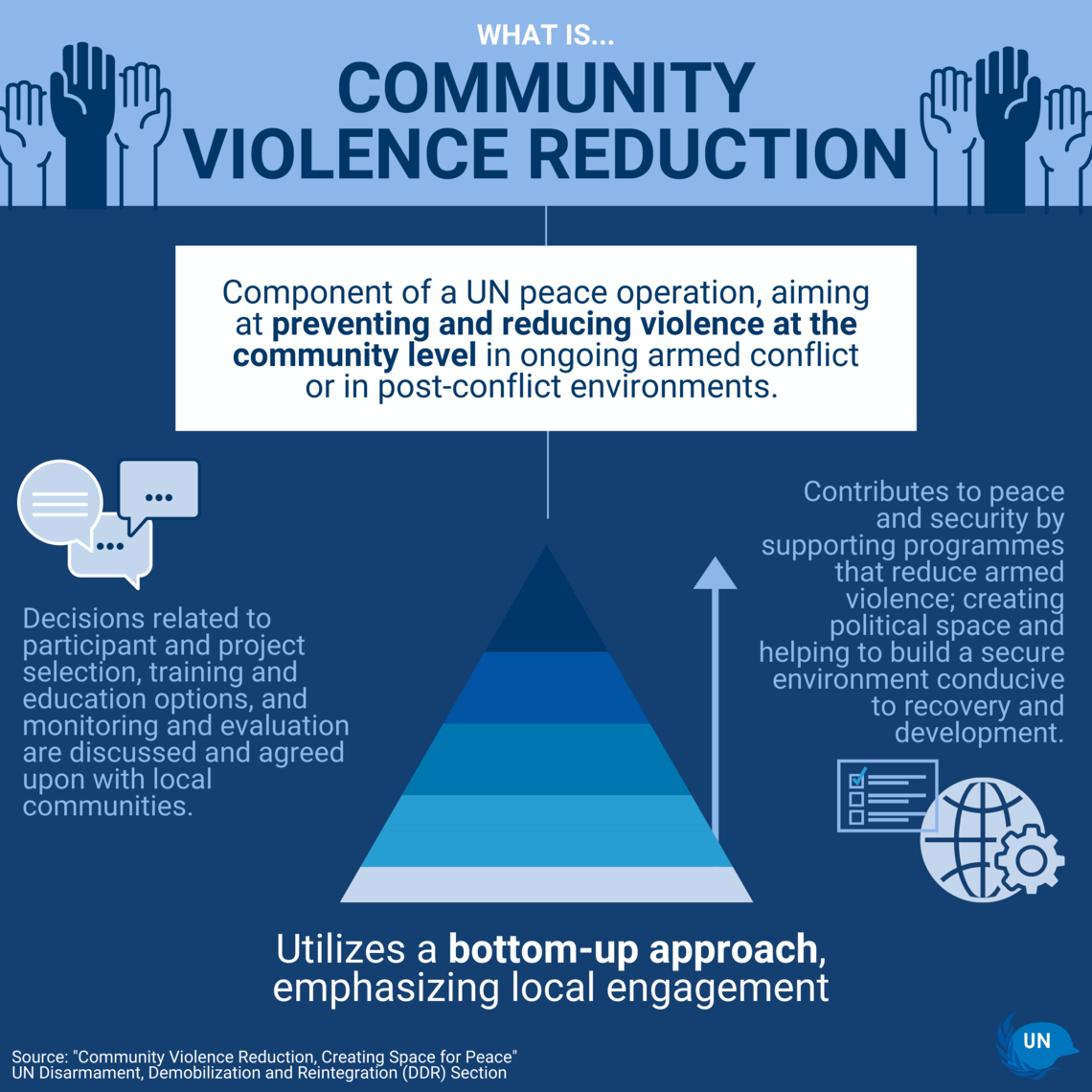 مع تكليفها الآن في جمهورية أفريقيا الوسطى، وجمهورية الكونغو الديمقراطية، وهايتي، ومالي، نفذت الأمم المتحدة برامج للحد من العنف المجتمعي تشمل مجموعة من المبادرات، بدءاً بالمشاريع كثيفة العمالة، وحاضنات الأعمال، ومنتديات الحوار المجتمعي، وحتى المشاركة المباشرة مع أعضاء الجماعات المسلحة، وكذلك الشباب المعرضين للخطر، لمنع المزيد من عمليات التجنيد. ويلعب الحد من العنف المجتمعي أيضاً دوراً رئيسياً في الحد من التوترات على المستوى الشعبي لزيادة فرص التماسك الاجتماعي وحل النزاعات.
