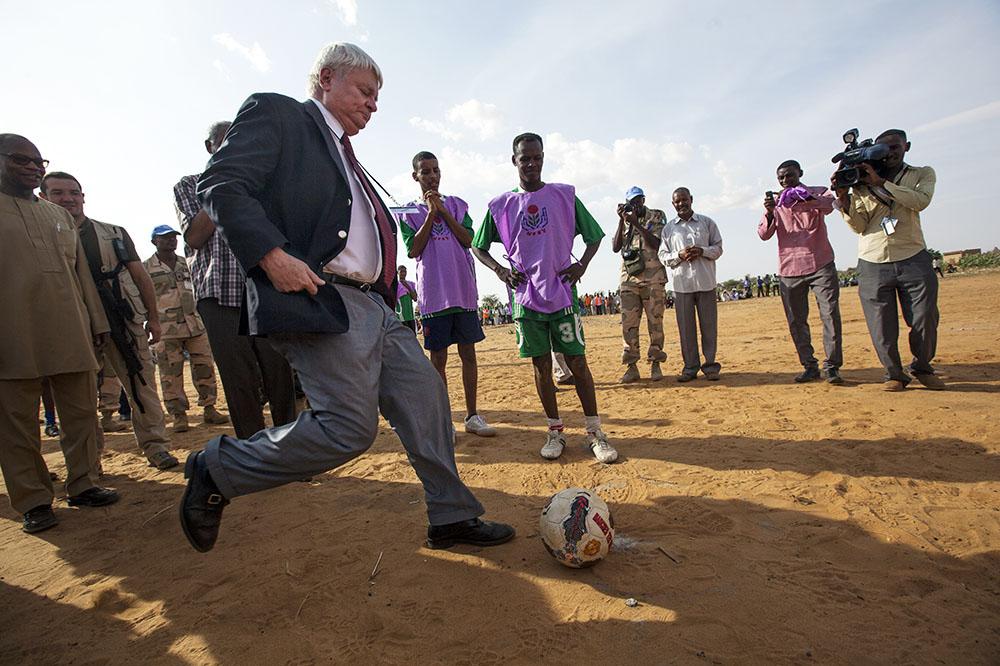 USG Hervé Ladsous, takes the kickoff to start a football match in Al Neem camp for Internally Displaced Persons in El Daein, East Darfur. Photo by Albert González Farran, UNAMID. Khartoum, 5 July 2013—The United Nations Under…
