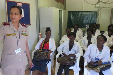 A member of the UNMISS Indian Battalion medical corps training nursing students at Upper Nile University, Malakal. Twenty-six students enrolled in a four-year degree course at the university are benefitting from the expertise…