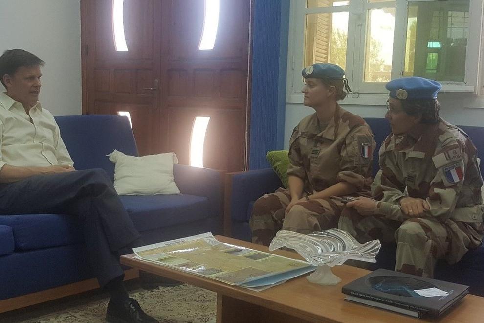 SRSG at his office with French UNMOs On 7 September 2019, at Mission HQ in Laayoune, Capt. (Fr. AF) Valérie Vreullie and Capt. (Fr. Ar.) Ophélie Bernencker paid a courtesy visit to the Special Representative of the Secretary…
