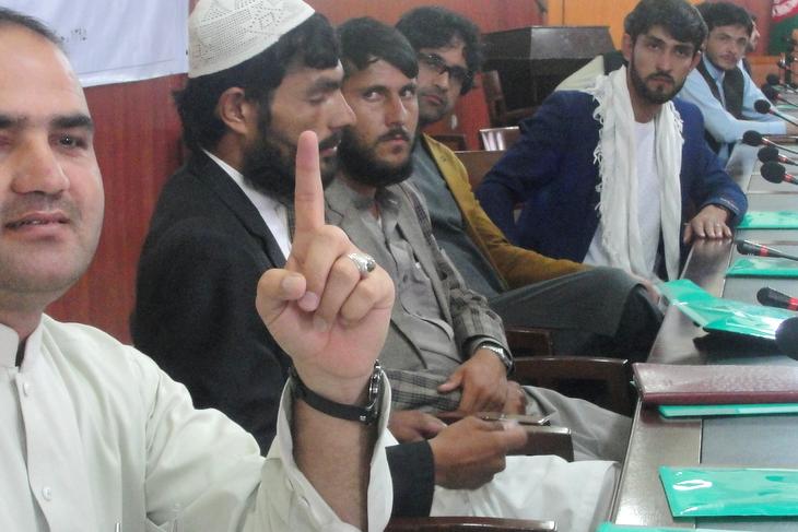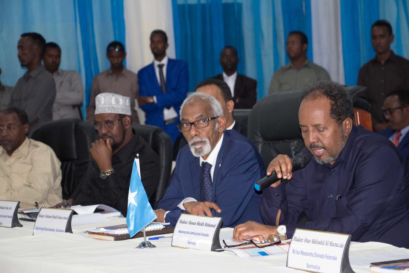 The president of Somalia, Hassan Sheikh Mohamud (left) speaks during the National Leadership Forum (NLF) in Baidoa on June 23, 2016.