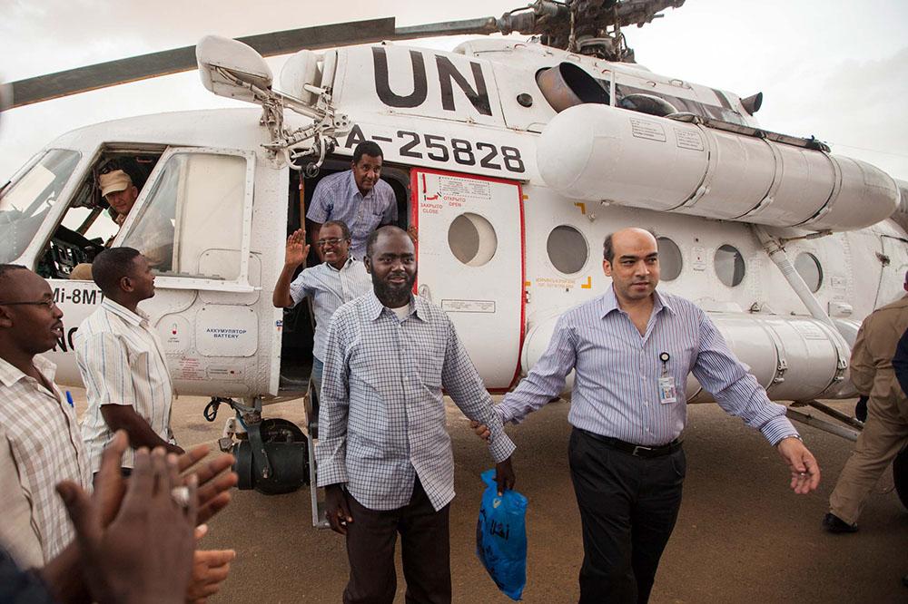 The three humanitarian workers are guided by a UNAMID security officer upon their arrival at El Fasher airport, North Darfur. Photo by Albert González Farran El Fasher, 19 July 2014 – Three Sudanese humanitarian workers…