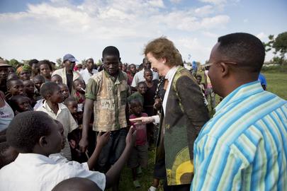 Mary Robinson (centre right), Special Envoy of the Secretary-General for the Great Lakes Region, is greeted by children during her visit to Kiwanja, North Kivu Province, in the Democratic Republic of the Congo (DRC). 29…