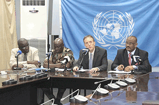 UN Police Advisor Dalip Soni conferring with a South Sudan National Police Service officer in Juba. Seeking to assist in building the capacity of local police, UN Police officers mentor local counterparts as part of their…