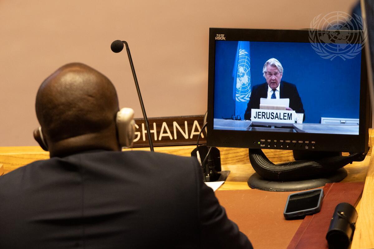Tor Wennesland (on screen), Special Coordinator for the Middle East Peace Process, briefs the Security Council meeting on the situation in the Middle East, including the Palestinian question. (UN Photo / Eskinder Debebe - 22 March 2022)