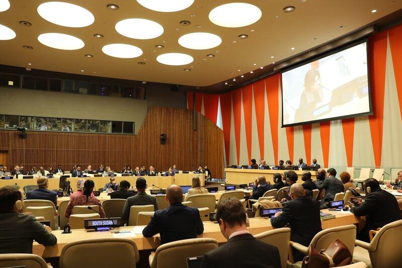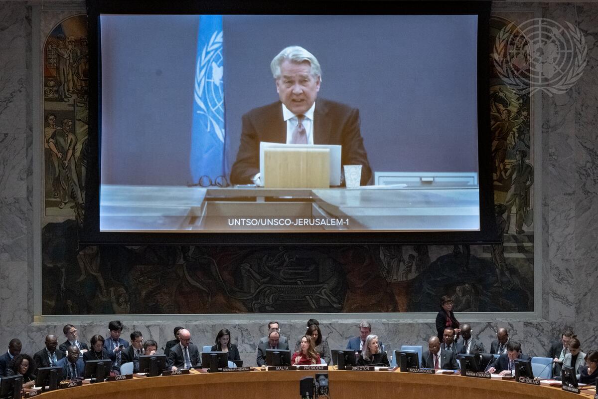 Tor Wennesland (on screen), Special Coordinator for the Middle East Peace Process, briefs the Security Council meeting on the situation in the Middle East, including the Palestinian question. (UN Photo/Eskinder Debebe - 20 February 2023)