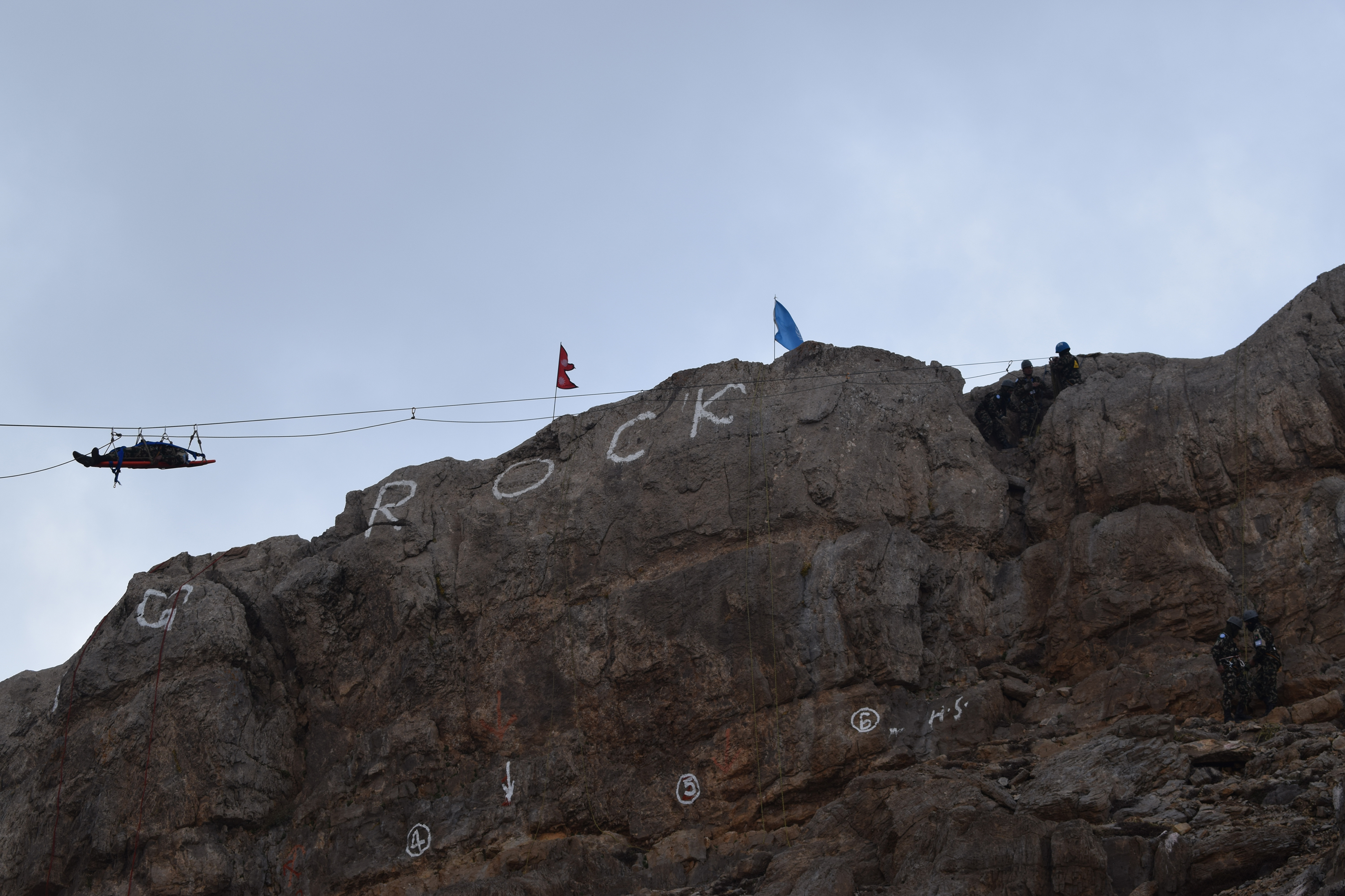 One of the highlights of the visit, aside from the impressive view (albeit cloudy) from the top of Mount Hermon, must have been the rock-climbing and mountaineering demonstration provided by the highly-skilled troops of NEPCON IX. Following a demonstration of their 'basic' rock-climbing skills, such as single and multi-pitch climbs, abseiling and tactical manoeuvres, a scenario of a casualty extraction was conducted. The scenario involved using a rope slide to extract a badly injured soldier from the top of the rock-face and securely deliver him to the ambulance. The casualty was delivered safely, in good time, and with adequate protection - an undoubtedly impressive display by NEPCON IX and Lt Col Pokhrel.